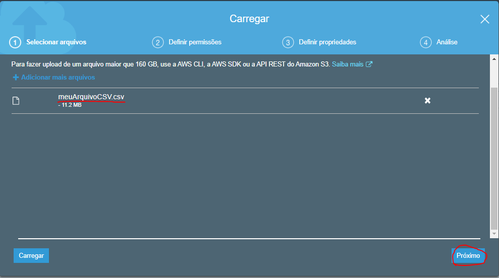 A tela de Upload será apresentada. Adicione o objeto desejado (no caso, foi adicionado o arquivo ‘meuArquivoCSV.csv') e clique no botão 'Próximo’, conforme apresentado na Figura 5 abaixo.