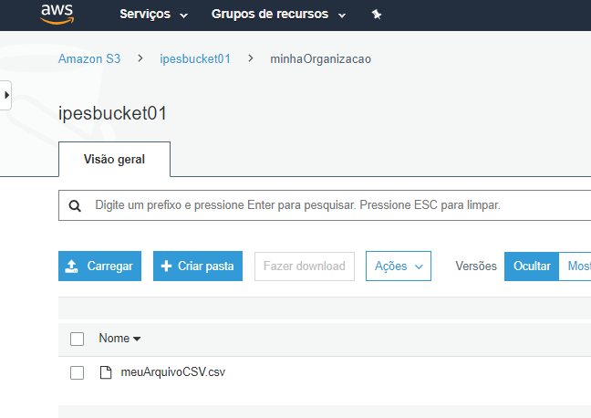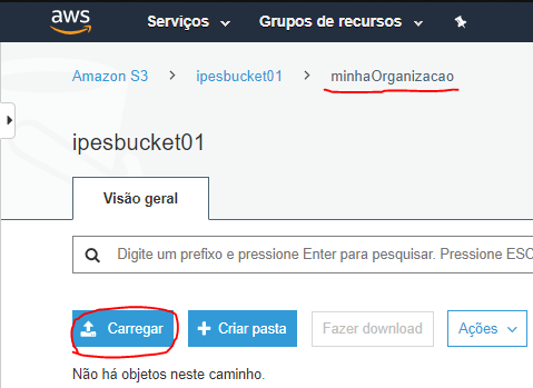Será apresentada a lista de buckets disponíveis (Figura 3). Selecione o bucket 'ipesbucket01' e em seguida, localize a pasta referente à sua organização. Neste documento será utilizado a pasta minhaOrganizacao.