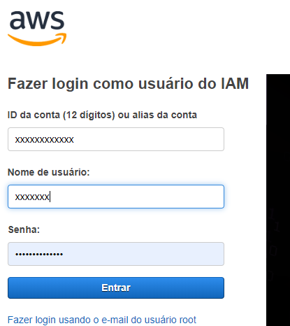 Acesso o link da console aws disponibilizado via e-mail. Na página apresentada, insira o Alias da conta AWS, o usuário e senha informados, conforme exibido na Figura 1 abaixo. É bastante comum que ao se clicar no link o alias da conta seja preenchido automaticamente.
