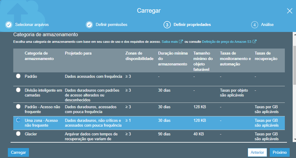 Em seguida, selecione o tipo de armazenamento atribuído ao objeto, conforme apresentado na Figura 7, selecione o armazenamento do tipo “Uma zona - Acesso Não frequente” e clique em ‘Próximo’.