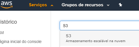 Após o login será apresentada a console AWS. No menu 'Serviços' (localizado no canto superior-esquerdo da tela) localize ou busque pelo serviço S3, conforme apresentado na Figura 2.